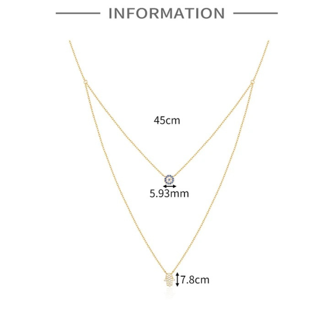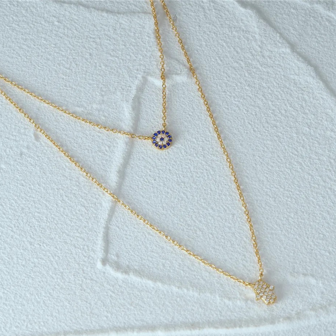 Verleihen Sie Ihrem Schmuckkästchen einen Hauch von Schutz und Eleganz mit unserer goldenen Doppelreihe Halskette. Diese außergewöhnliche Kette kombiniert zwei kraftvolle Symbole: das Böse Auge und Fatimas Hand, um Ihnen sowohl stilvolle Schönheit als auch Schutz zu bieten.