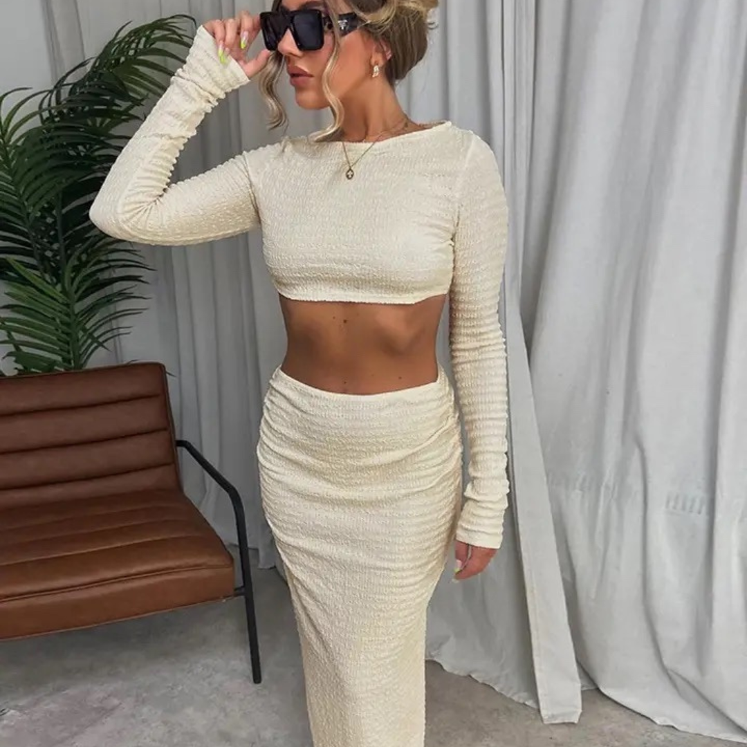 Entdecken Sie unser elegantes Zweiteiliges Set, das perfekte Zusammenspiel aus Stil und Komfort. Dieses modische zweiteilige Set für Damen besteht aus einem Langarm Crop Top und einem passenden Hüftrock, ideal für jeden Anlass – ob lässig oder elegant.