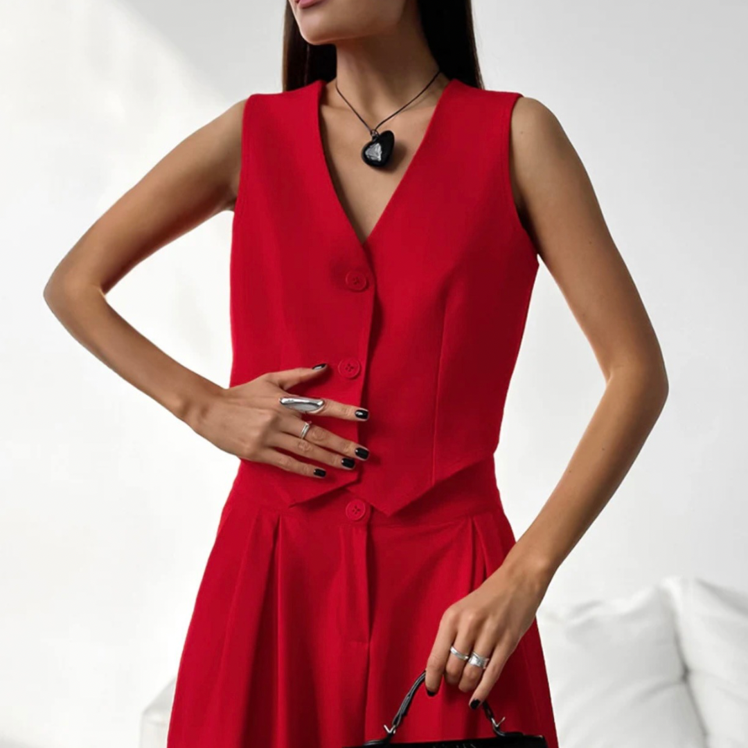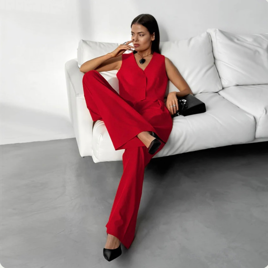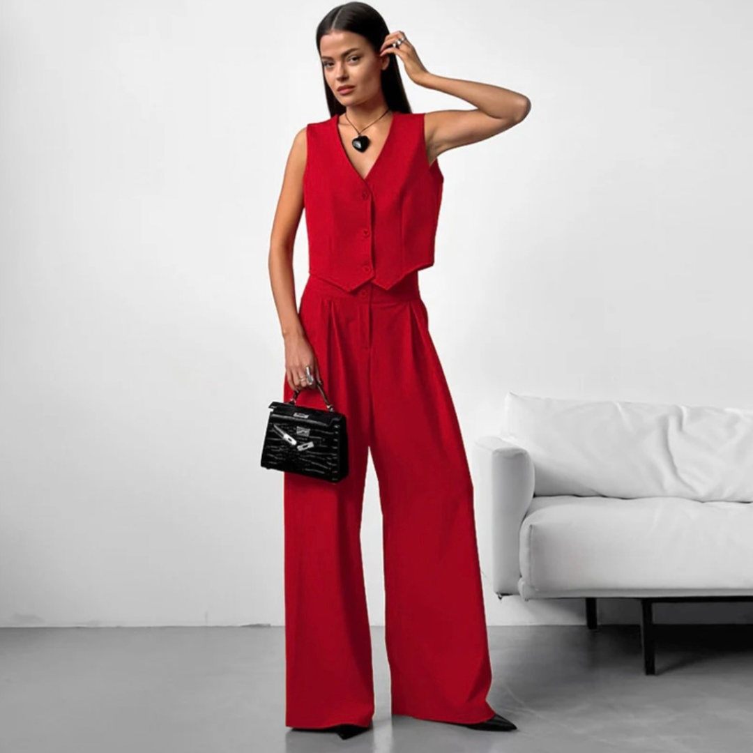 Verleihen Sie Ihrem Outfit eine auffällige Note mit unserem roten zweiteiligen Hosen Set für Damen. Dieses elegante Set besteht aus einer Weste und plissierter Hose und ist die ideale Wahl für professionelle Frauen, die sich stilvoll und selbstbewusst präsentieren möchten.