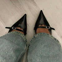 Erleben Sie zeitlose Eleganz mit unseren “Slingblack Heels” – die perfekte Ergänzung für jede stilbewusste Garderobe. Diese Damenschuhe überzeugen durch ein modernes Design mit spitzer Form, das Ihre Silhouette optisch streckt. Die flache schwarze Schnalle verleiht den Schuhen einen Hauch von Raffinesse, während der mittlere Absatz für optimalen Tragekomfort sorgt.