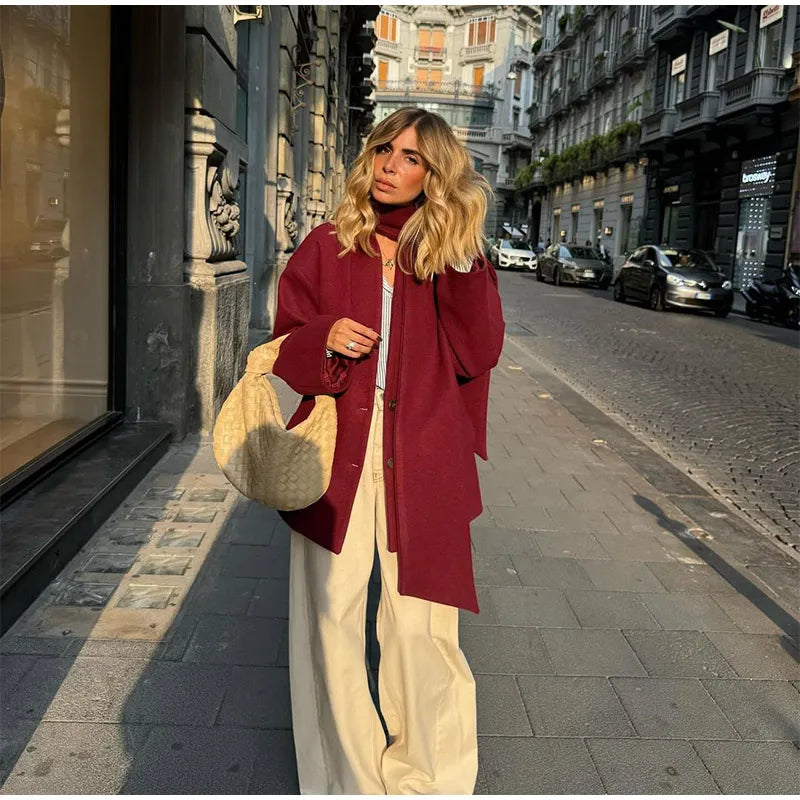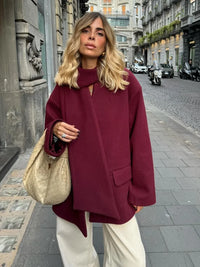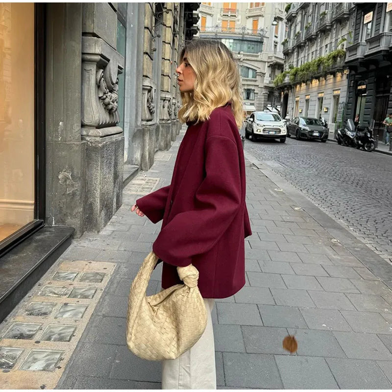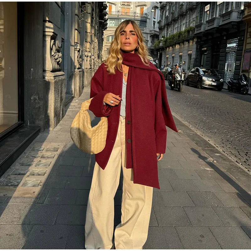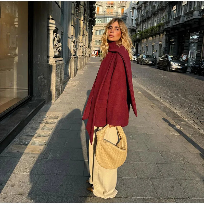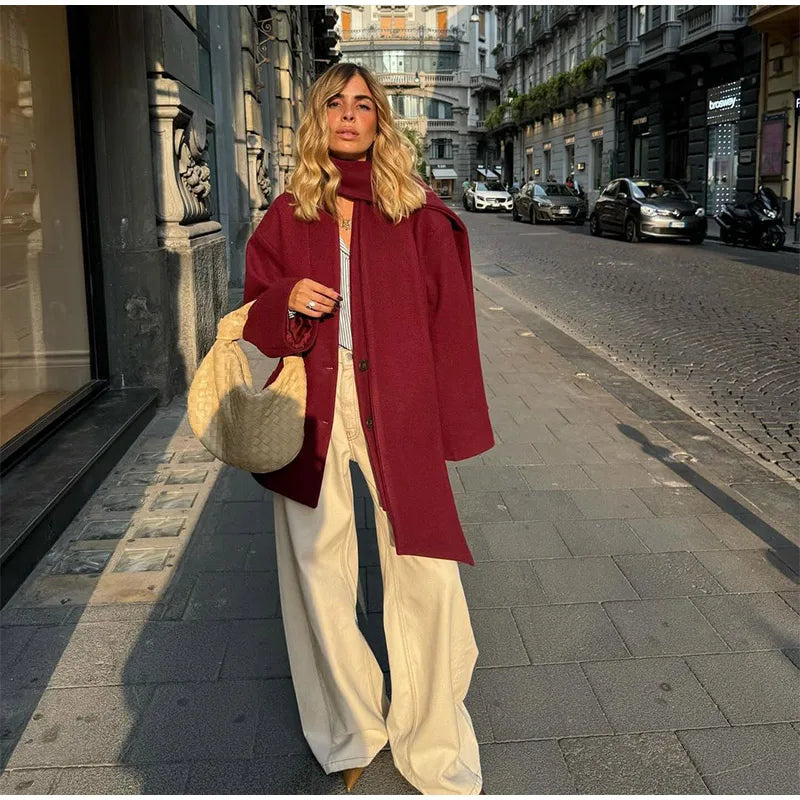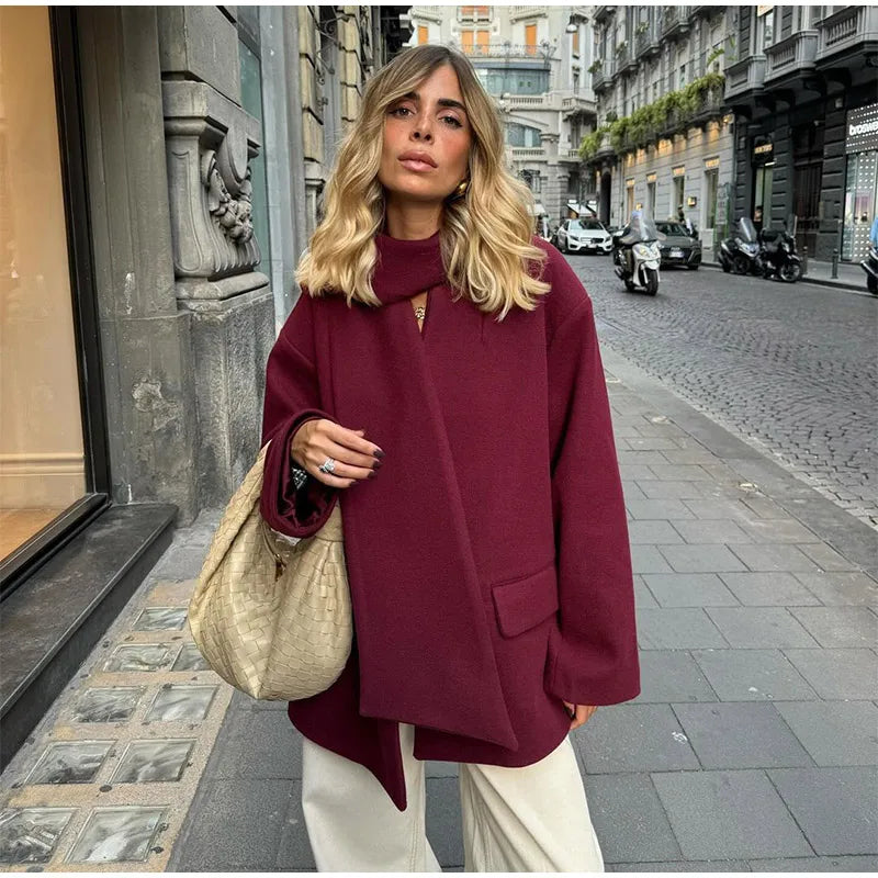 Model Number: 2024 New Fashion Burgundy Red Woolen Suit Jacket With Scarf Collar