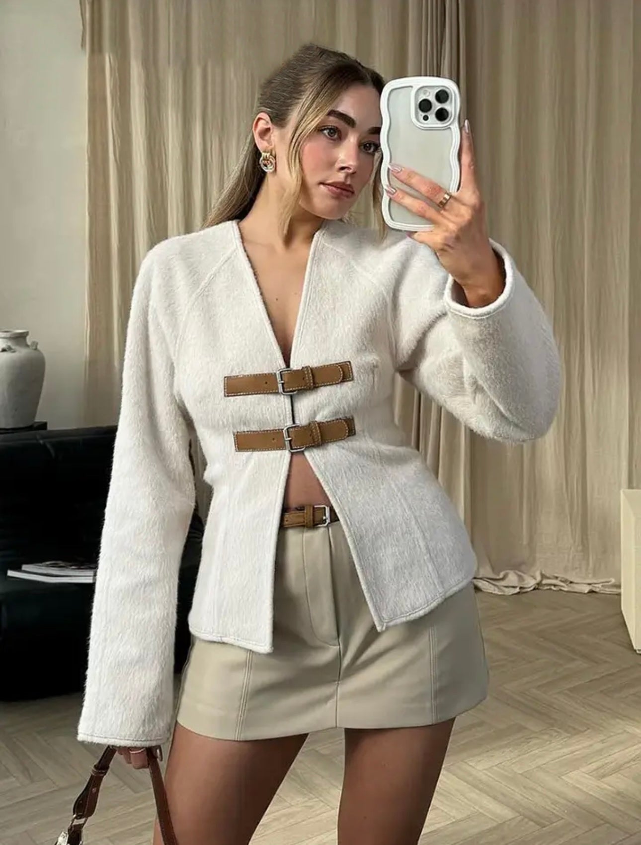 Verleihen Sie Ihrem Look eine stilvolle Retro-Note mit unserem Retro-Lederschnallen-Wollmantel für Damen. Dieser elegante Mantel mit V-Ausschnitt und Langarm-Design ist perfekt für die Übergangszeiten Herbst und Frühling. Das solide beige Design sorgt für eine zeitlose Optik, die sich wunderbar in jede Garderobe integrieren lässt.