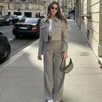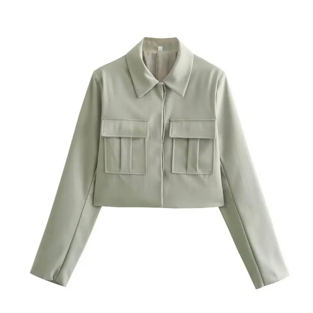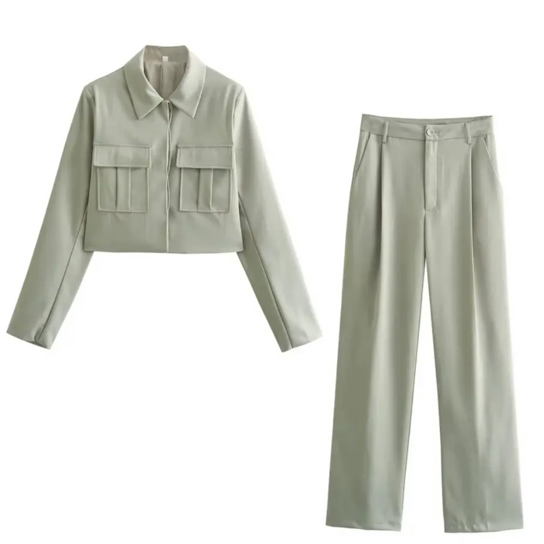 Entdecken Sie unser stilvolles pastellgrünes Zweiteiler-Set, das sowohl Eleganz als auch Komfort vereint. Dieses modische Ensemble besteht aus einer trendigen, kurz geschnittenen Jacke und einer hoch taillierten Hose. Die Jacke besticht durch einen scharfen Kragen, eine praktische Knopfleiste und zwei Brusttaschen mit Klappen, die nicht nur stilvoll, sondern auch funktional sind. Die Hose überzeugt mit eleganten Falten und einem geraden Bein, das eine schmeichelhafte Silhouette zaubert.