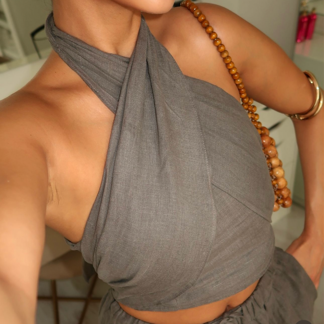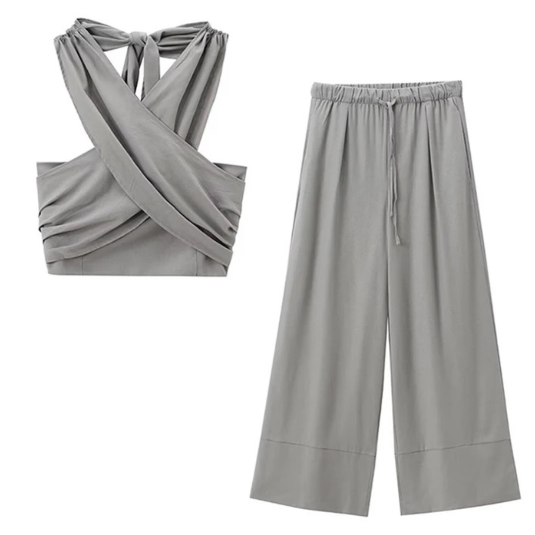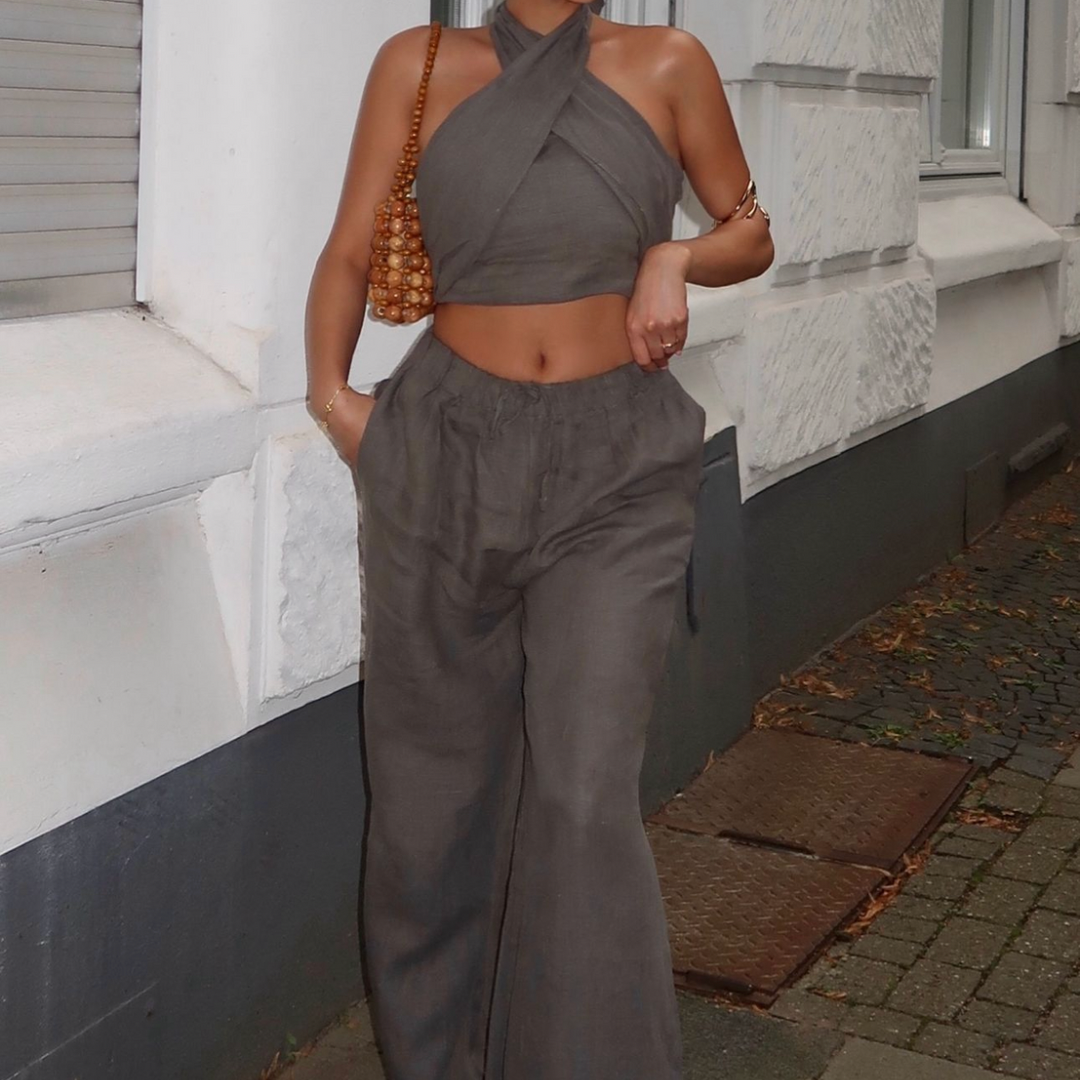 Erleben Sie zeitlose Eleganz mit unserem Sommer Set. Dieses stilvolle zweiteilige Outfit, bestehend aus einem Neckholder geknoteten Crop Top und einer hohen Taille Hose, ist das perfekte Ensemble für die warmen Monate des Jahres.