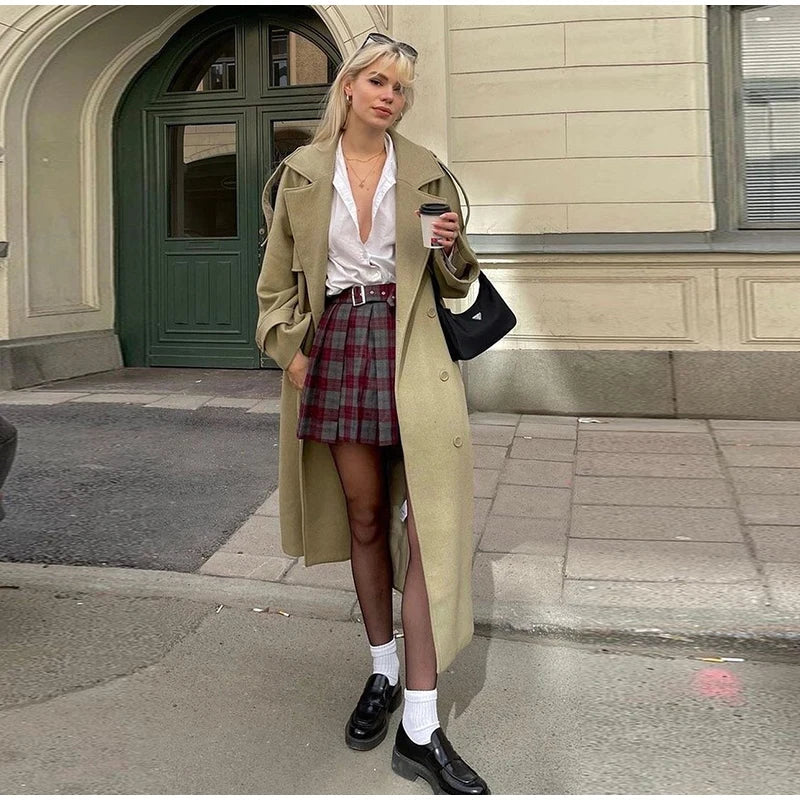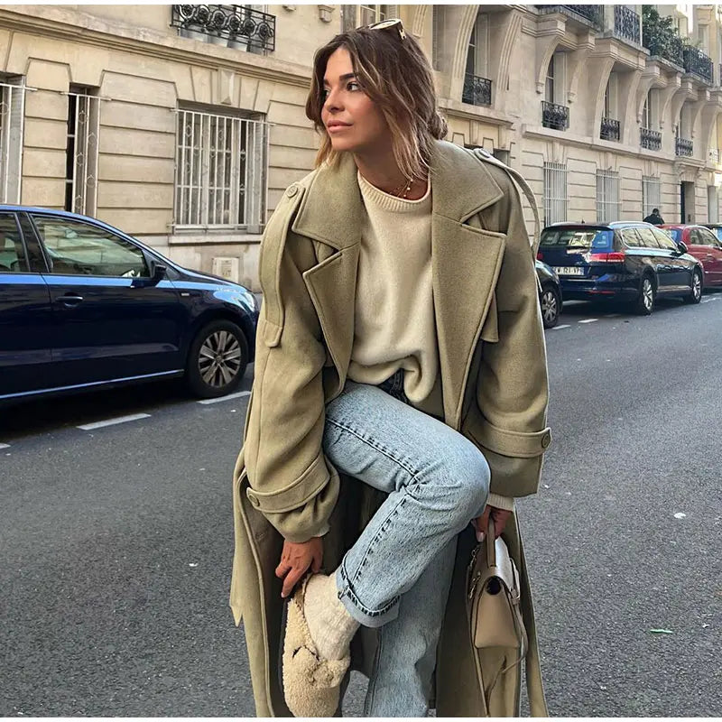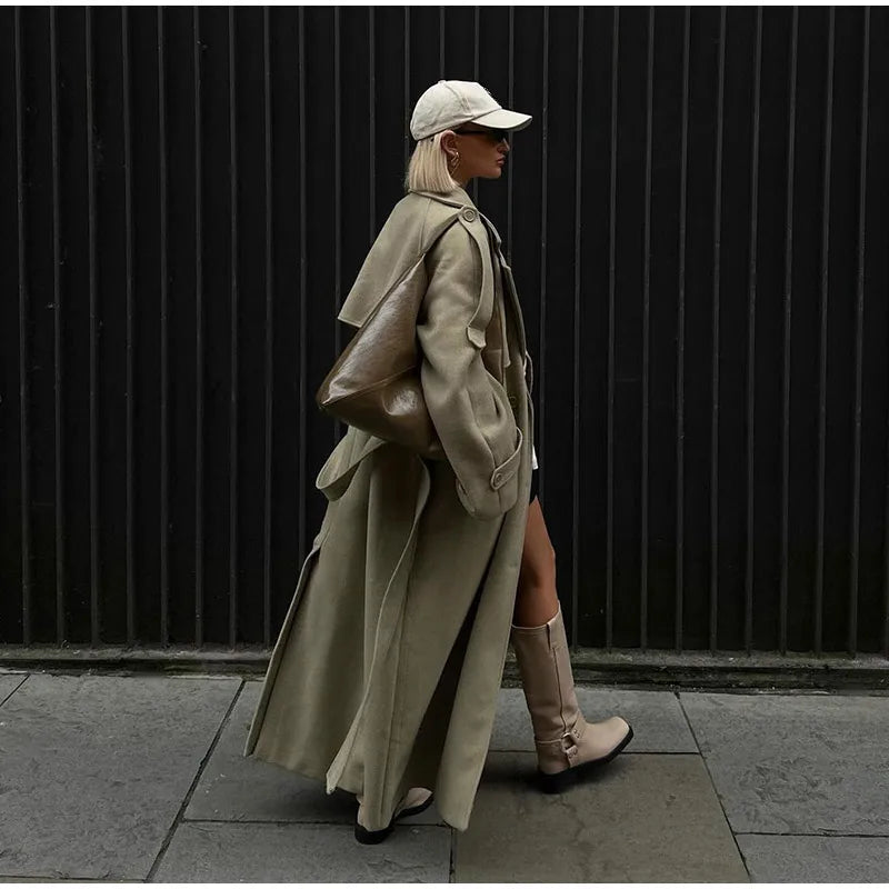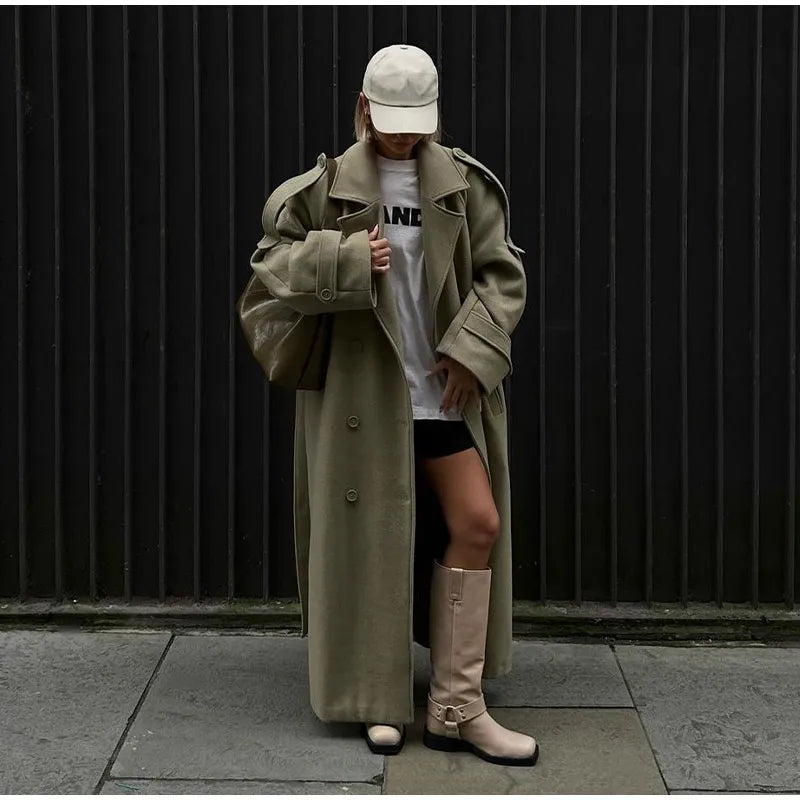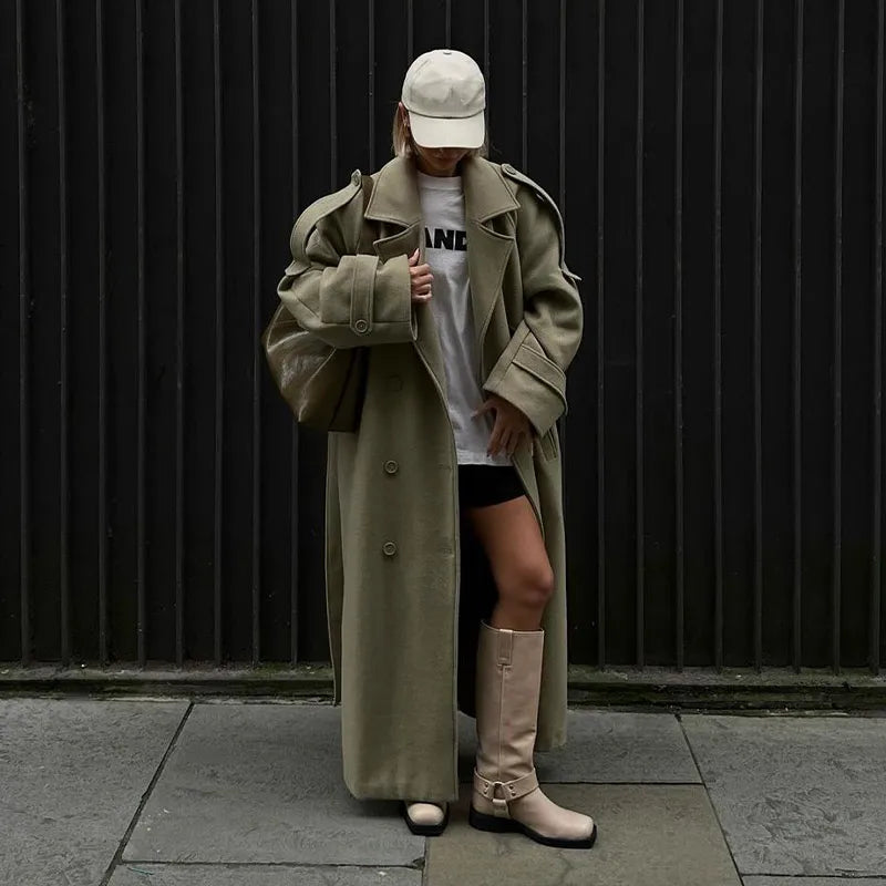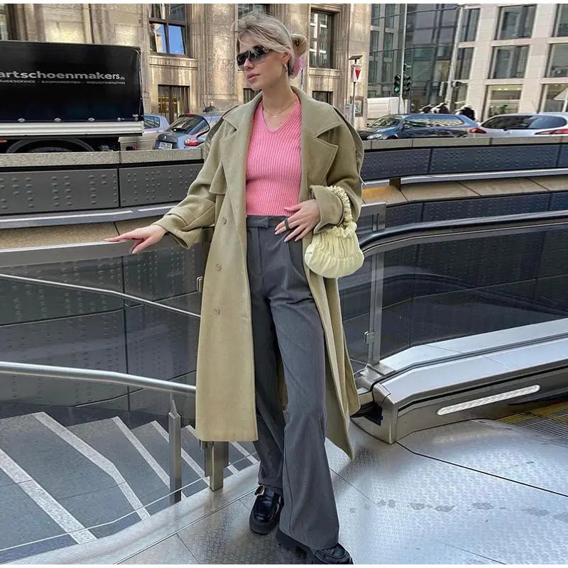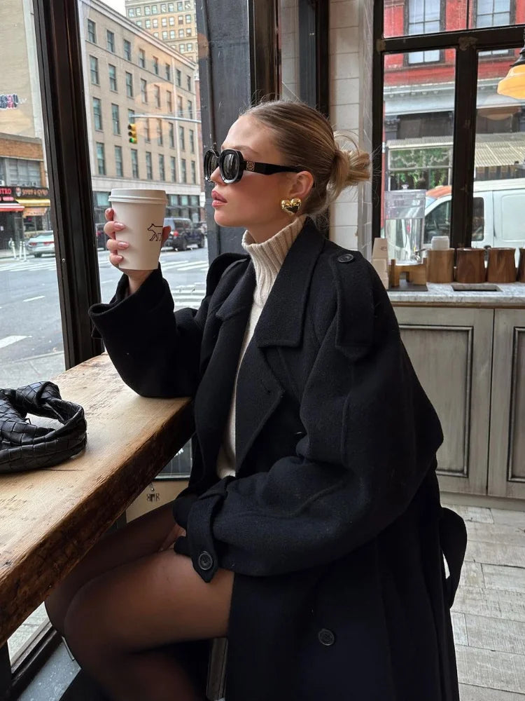 Vielseitigkeit und Kombinationsmöglichkeiten: Der Double-Breasted Wool Coat lässt sich sowohl zu Business-Outfits als auch zu Casual-Looks kombinieren. Tragen Sie ihn über einem Kleid für ein elegantes Büro-Outfit oder kombinieren Sie ihn mit Jeans und Stiefeln für einen entspannten, aber trotzdem eleganten Look. Die klassischen Farben wie Camel, Schwarz, Grau und Navy passen sich mühelos an verschiedene Outfits an.