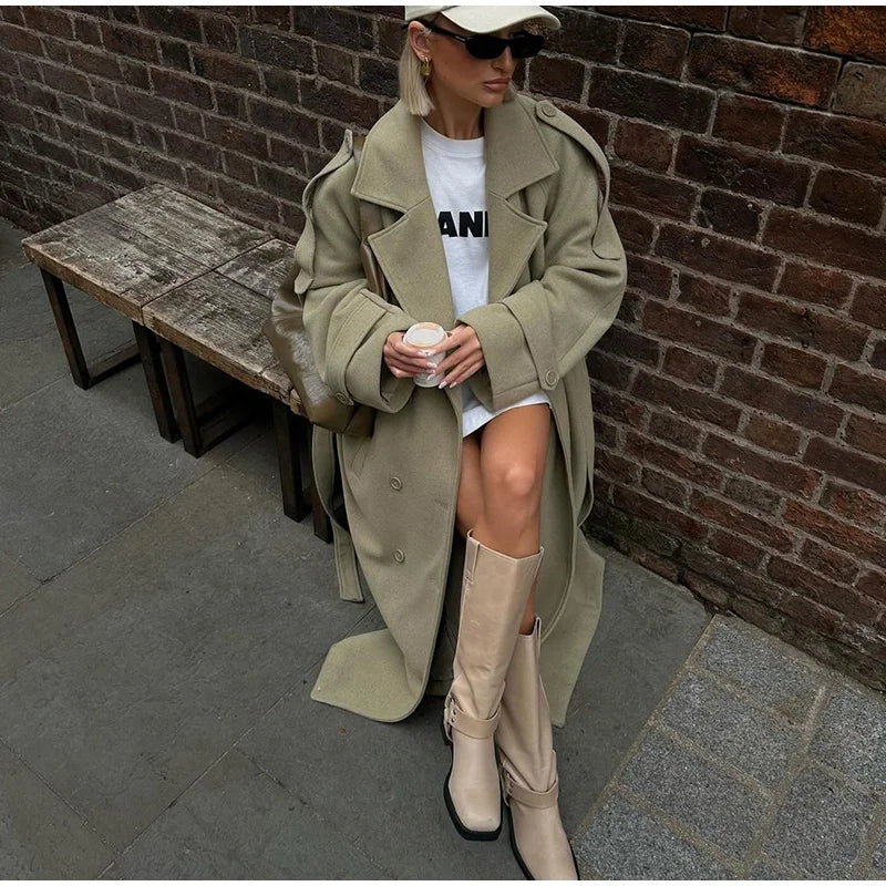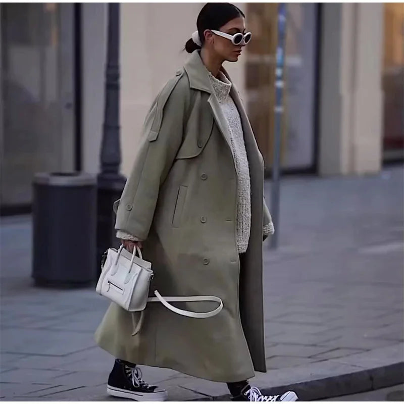 Verleihen Sie Ihrem Herbst- und Winterlook eine extra Portion Eleganz und Komfort mit dem Double-Breasted Wool Coat. Dieser klassische Wollmantel kombiniert den traditionellen doppelreihigen Knopfverschluss mit einem hochwertigen Wollmaterial, das Sie an den kältesten Tagen warm hält und gleichzeitig für einen modischen, stilvollen Look sorgt. Ein Muss für jede Frau, die sowohl Komfort als auch Stil in einem Mantel vereinen möchte.